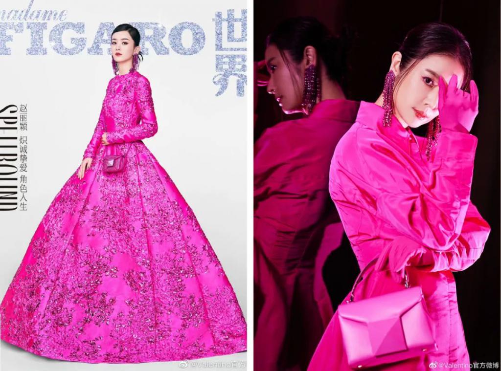 作为代言人,赞姐是全球首位穿上Valentino Pink PP系列的人。