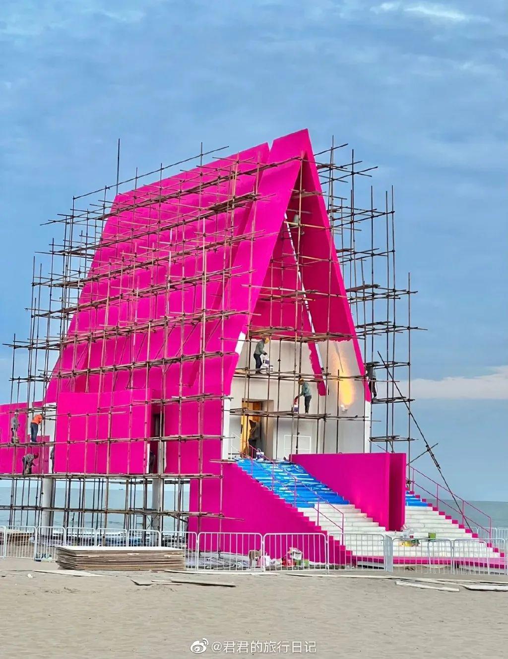 为了呼应主题,品牌直接把小教堂刷成了芭比粉,像不像《楚门的世界》,有种无法言说的戏剧感。