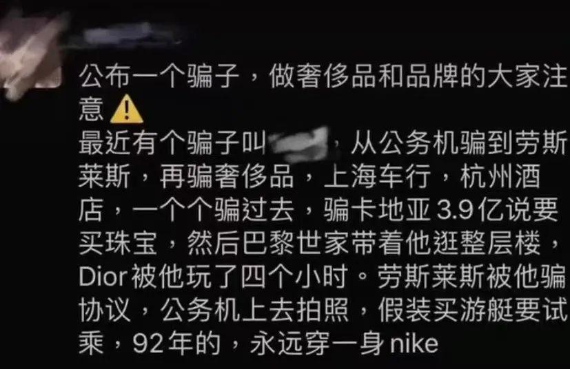 而在国内,也有抖音博主、上海某车行老板爆料,一个假大哥靠着身份造假,在魔都奢侈品圈子里白嫖了一个遍,最后人间蒸发。