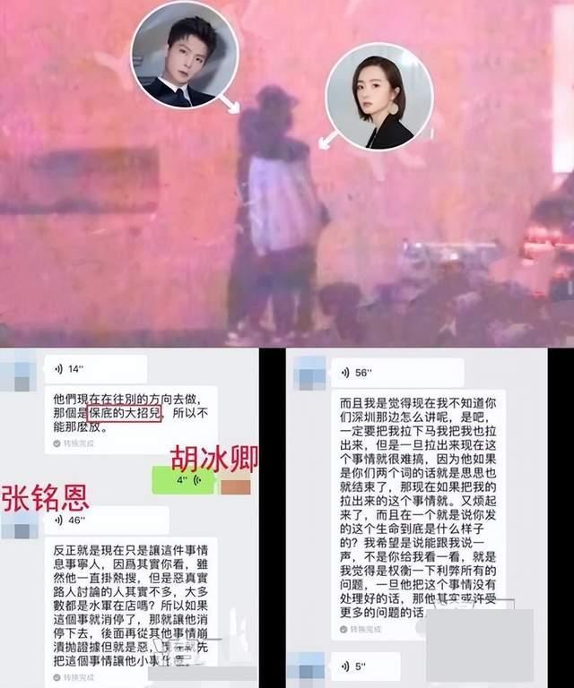 2020 年 6 月,有媒体拍到他和胡冰卿疑似接吻的照片,之后网上流出张铭恩手把手教胡冰卿怎么给徐璐泼脏水。