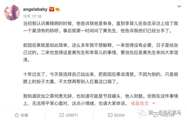 2021 年 1 月 6 号,杨颖发布了一条微博,字字铿锵、句句霸气,总结一下就是她不是小三,李菲儿把莫须有的称号给了她,这些年来黄晓明还不担当。