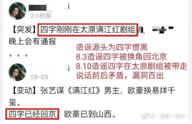 此外,易烊千玺的粉丝也拿出证据重锤造谣者,其中指出爆料者前后说法不一致,此前在 8 月 3 日,爆料者说易烊千玺被换了角色,已经返回北京,而代替易烊千玺的则是欧豪,而在 8 月 10 日又说易烊千玺在太原剧组被带走,前后说法矛盾,其中真假着实不难分辨。