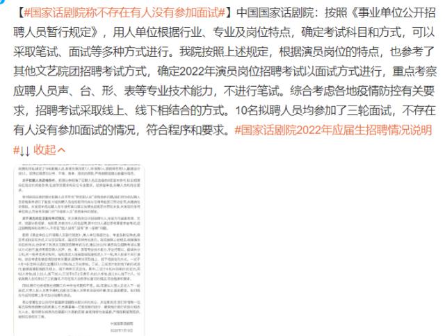 至于有网友提出自己并未收到第三轮面试通知的质疑,国家话剧院也给出相应的解释,表示每轮面试入围者都会由院方予以通知,未入围者不再另行通知,简而言之,只有入围下一轮考试者才能收到面试通知。