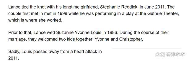 对于兰斯的离世,最悲伤的莫过于他的家人。据悉,兰斯曾有两段婚姻,他与前任妻子诞下两子,不幸的是,前妻因心脏病于 2011 年离世。之后,兰斯再结良缘,和女友斯蒂芬妮喜结连理。没想到,如今兰斯竟然撒手人寰,留给家人无限的伤悲。