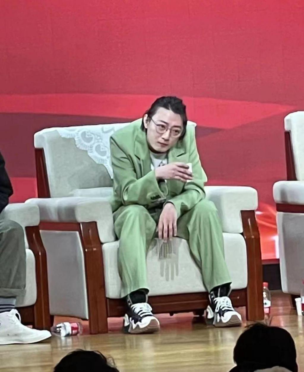 随后,苏小玎在讲台上落座,他举着茶杯肩膀耸着,眼神盯着某处,一副若有所思的样子。