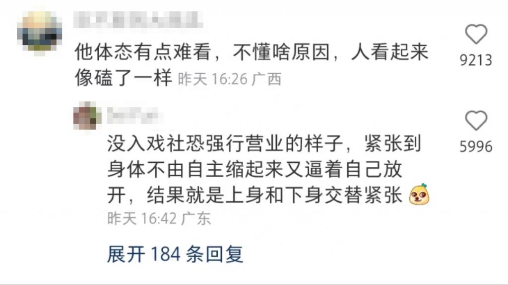 或许是苏小玎坐着的模样非常诙谐的缘故,有不少网友纷纷在评论区留下了自己的观点," 他体态有点难看,不懂啥原因,人看起来像磕了一样 ",随后有网友为苏小玎解释道:" 没入戏社恐强行营业的样子,紧张到身体不由自主缩起来又逼着自己放开,结果就是上身和下身交替紧张 "。