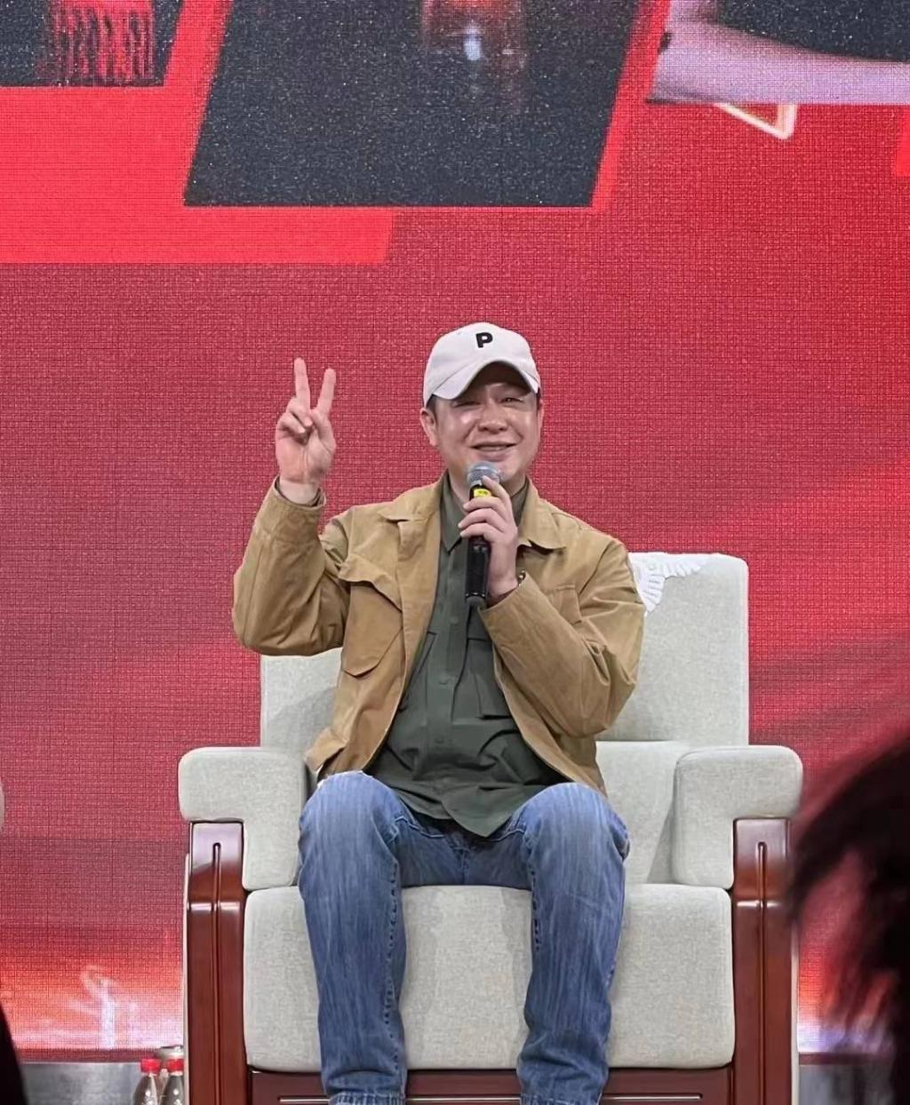 张颂文的打扮十分朴素简单,人已中年的他看得出来有些发福,肚子突起,身材略有些圆润。张颂文戴着鸭舌帽,举着手比耶,表情十分可爱。