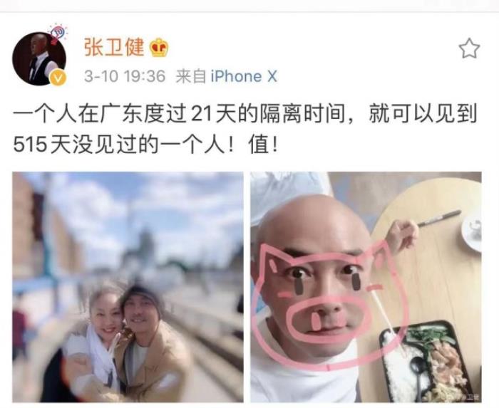 张卫健写道:一个人在广东度过21天的隔离时间,就可以见到515天没见过的一个人!值!