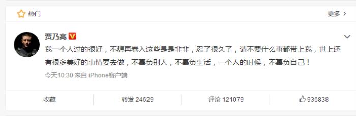 之后,薛之谦再次被带上热搜,贾乃亮发博表示:“我一个人过得很好,不想再卷入这些是是非非,忍了很久了,请不要什么事都带上我,世上还有很多美好的事情要去做,不辜负别人,不辜负生活,一个人的时候,不辜负自己! ”