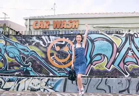 一身牛仔连衣裙,朝气满满。
