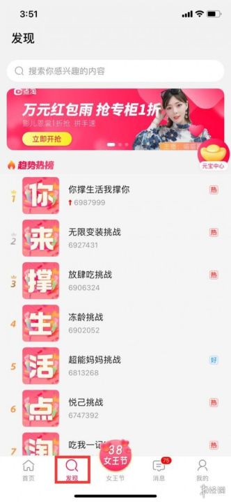 2、点击进入点淘APP,点击下方的发现搜索李佳琦,进入李佳琦直播间。