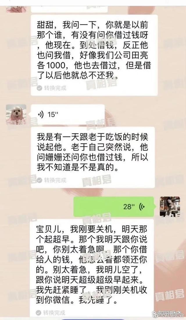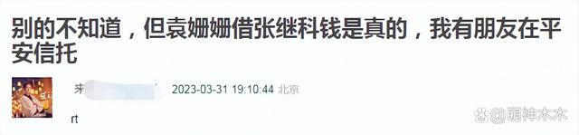 自称朋友职业是信托的网友爆料称袁姗姗借张继科钱是真的,金额有 500 万左右,事情发生在几年前,整个部门都知晓。此外,有爆料称袁姗姗在与张继科恋爱期间,曾借了对方几百万,分手后没有还钱,袁姗姗找杨幂帮忙把钱要了回来,这情节与狗仔的漫画剧情差不多。