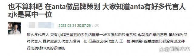 甚至某运动品牌策划爆料称张继科爱白拿品牌店的衣服,隔三岔五就会到店里拿一堆衣服不给钱。她称该品牌代言人还有谷爱凌、关晓彤、王一博,只有张继科有这种行为。
