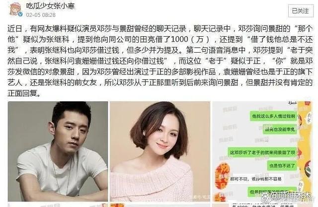 另外,曾有狗仔晒出邓莎与景甜的聊天记录中,也显示疑似张继科跟多位圈内有人借过钱,包括田亮、邓莎、袁姗姗、景甜等,邓莎是从于正那得知张继科有跟景甜借过钱,便找到景甜询问,只是景甜没有肯定回复,只说怎么着张继科都会还。
