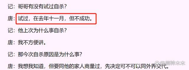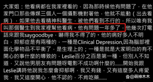 张国荣的大姐张绿萍曾在采访中说到张国荣一直在她家接受医生治疗,有问题一年多了,那么按照时间来算的话,也确实和唐鹤德采访中说的对应上了,生前尝试过自杀就是因为生病了。重点是张国荣还曾说过自己如果不是很严重不会去看医生的,2003 年 4 月 1 日,对他来讲应该是极限了。