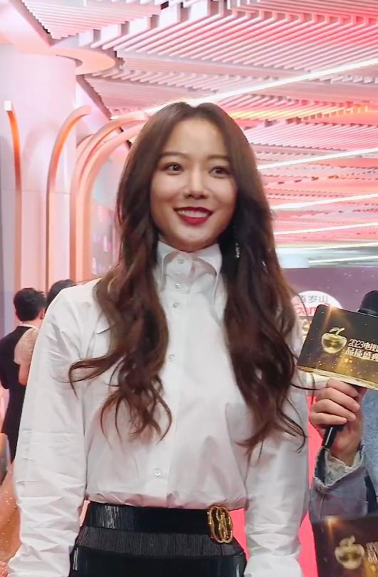 王珞丹略显保守,穿的是偏向职业装的打扮,一脸甜笑,不知道是不是没休息好的原因,脸有点肿,苹果肌比较饱满。