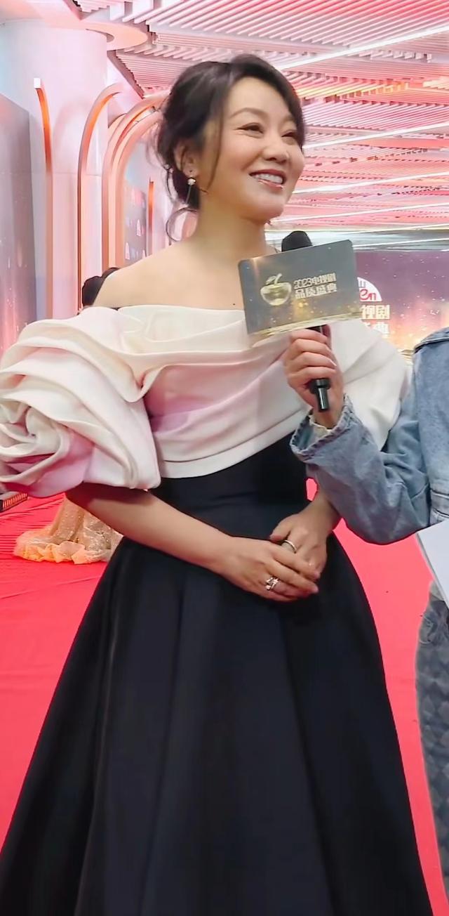 闫妮的礼服尽显优雅大方,笑起来有一种春天的感觉,虽然她已有 52 岁,脸上也有一些法令纹和眼纹,但依然掩盖不住她的风情万种。