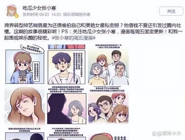 甚至张小寒还曾有过一段漫画爆料,称某跨界转型综艺咖的男星借钱不还,偷拍自己和女明星私密照。
