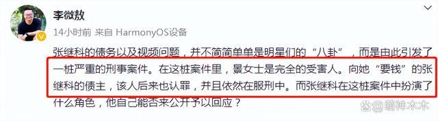 他还提到张继科把跟景甜恋爱期间知道的秘密告诉自己赌债的债主,要债主找景甜敲诈勒索要钱还赌债,结果债主被判刑三年。这个说法与李微敖一致,他透露张继科债务风波及视频问题不是明星的八卦,而是刑事案件,债主认罪且正在服刑。