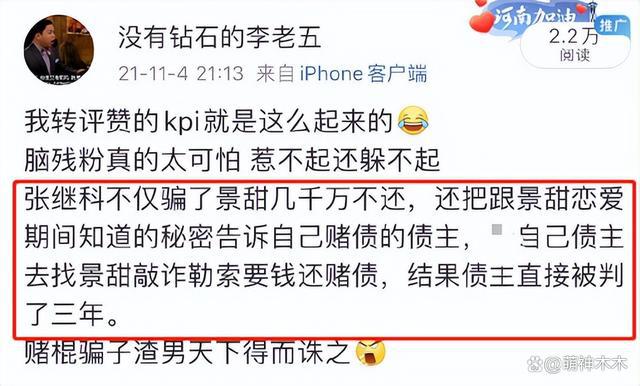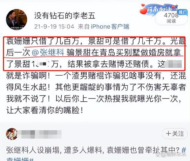 根据截图时间线,这名网友从 2021 年 9 月开始锤张继科。他称袁姗姗只借给了张继科几百万,景甜借了几千万,最后一次骗景甜在青岛买别墅做婚房就拿了一千万,结果被拿去做了赌债,斥责张继科活生生的诈骗。