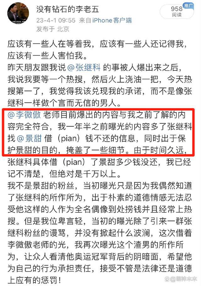 4 月 1 日,又有疑似知情网友发文力挺李微敖,表示他所述内容与自己了解到情况完全符合,并兑现承诺给张继科火上浇油。