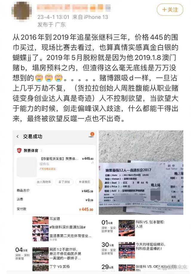 张继科的粉丝看到各种爆料,晒出购买的周边及看球赛的朋友圈截图,表示当初脱粉就是因为知道他在澳门赌博,塌房意料之中,但是没有想到如此没有下限。