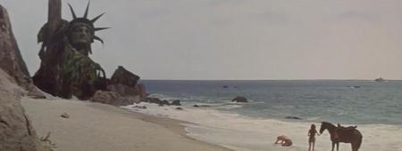 比如,当看到自由女神像,船长泰勒才知道,自己仍是在地球上,原来自己来到了未来,并了解到人类失去领导力而被人猿统治的真相,居然是人类自己的热核武战争酿成的恶果。