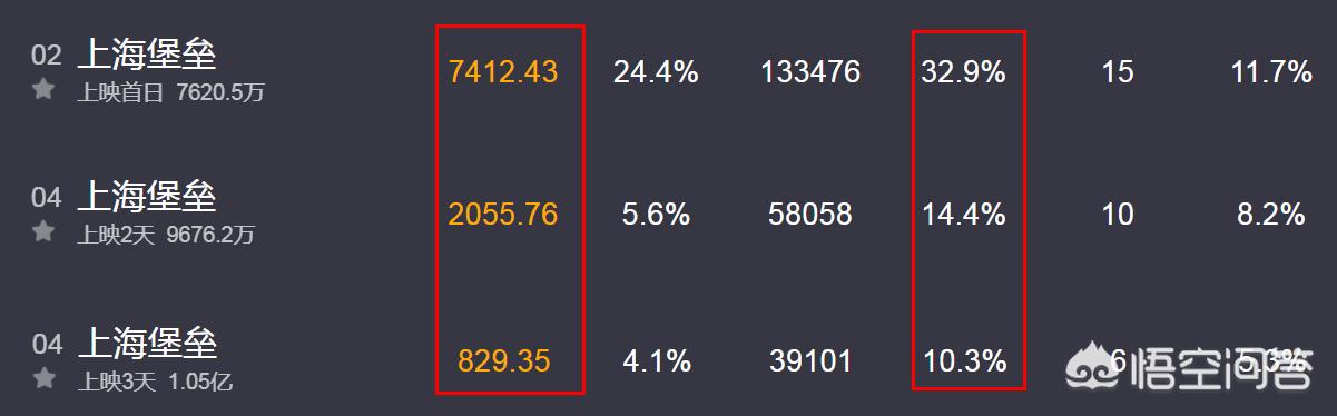 《上海堡垒》上映两天半目前票房为将近1.05亿,除了首映当天爆发的票房7412万,第二天票房只有惨淡的2055万,而今天截止15:38目前票房仅仅为829万,估计今天票房能达到1200万左右。与票房断崖式滑落成正比的是电影的排片占比,目前已由首日32.9%的排片占比,下滑至如今的10.3%。