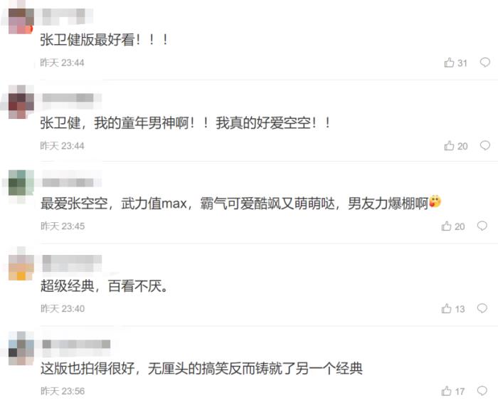 不少粉丝还称最爱张卫健饰演的孙悟空,武力值很大,霸气、可爱、酷飒,而又萌萌的,男友力爆棚,此外,还有粉丝表示这版《西游记》无厘头的搞笑反而铸就了另一个经典。