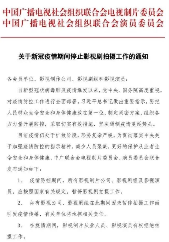 刚刚,中国影视制片发布了官方消息:在疫情期间停止所有影视剧的拍摄。