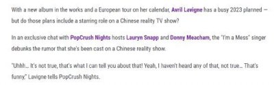 - 艾薇儿否认会参加《浪姐4》 称传言很有趣
