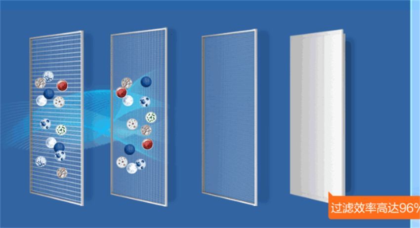 滤网过滤效果越好,空气质量越好。好的新风空调会采用HEPA滤网,过滤精度高,最高效率可达96%,防止灰尘杂物入侵。