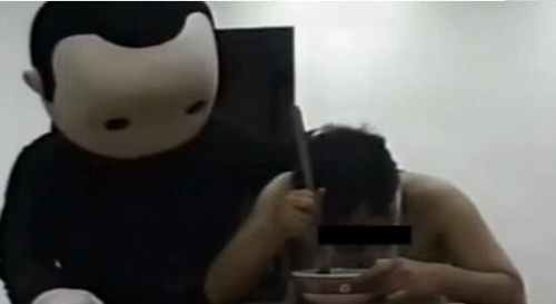 随后,身后出现了两个带着日本相扑样式的头套的人摸着他的头,根据天朝网民透露,这则视频是红色房间流出,那带着头套的男人把他饿了几天并要他吃他妻子的肉做的食物,目的是为了让他获得百倍的痛苦,吃了就成了杀害他妻子的罪人,不吃他自己将面临死亡。