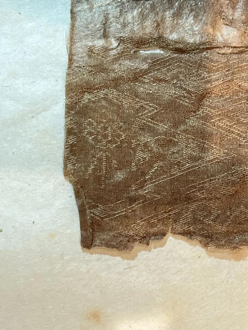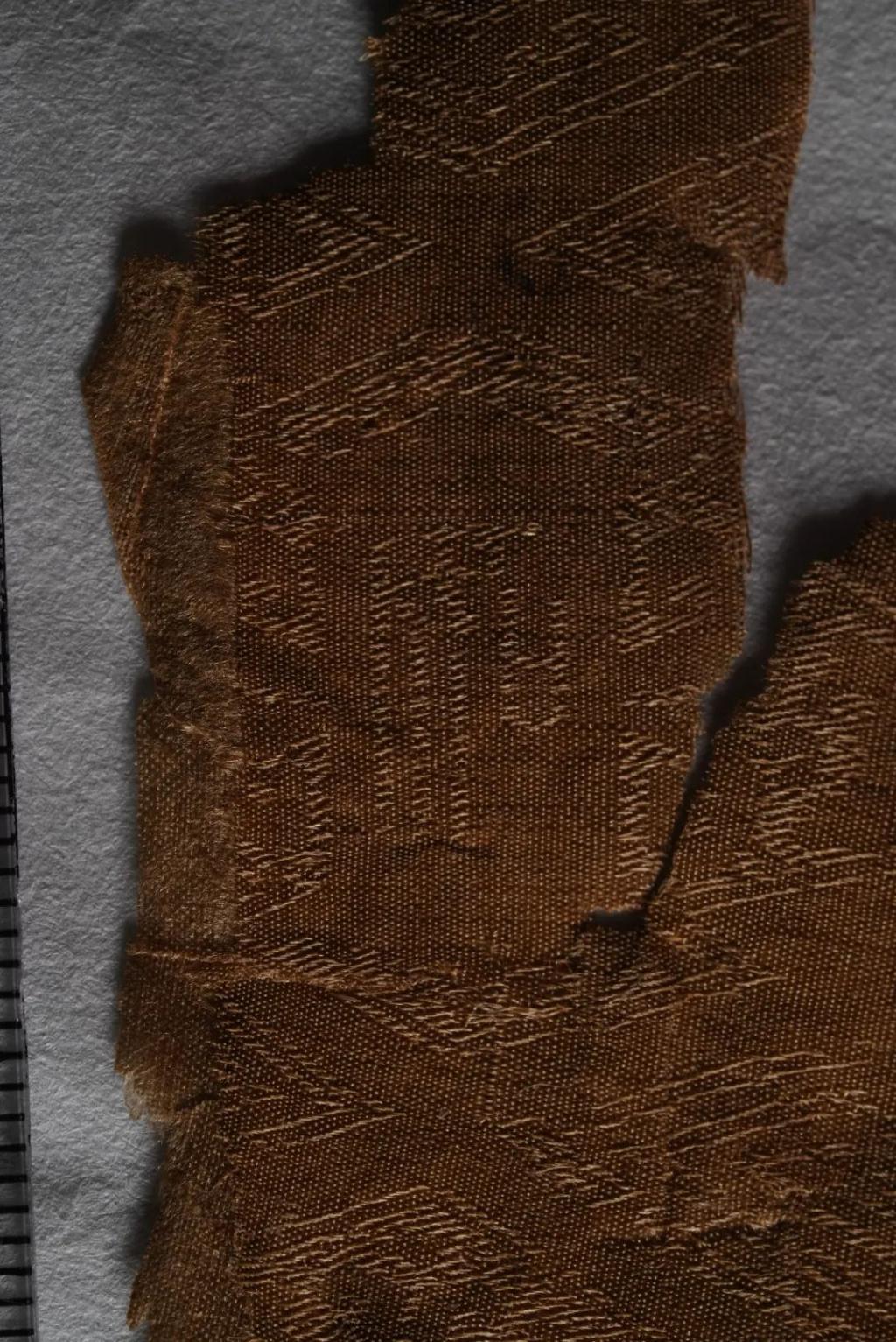 这是褐色菱纹绮丝绵袍残片。