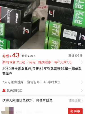 然而千不该万不该,我偏偏在这时候打开了神奇的拼多多,看到了一款叫做 “ 显卡盲盒 ” 的商品。再一看,嚯!300+ 人关注,拼单图片成功 150 次删除。