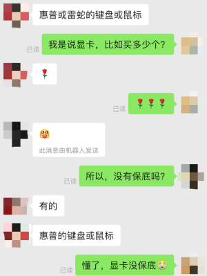 但很遗憾,这家的显卡盲盒没有保底。。。在哪能我一再追问下,客服可能是为了发加强我买盲盒的信心,过了好半天才跟我说,至少能拿到鼠标或者键盘。