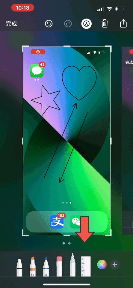 截屏后点击即可进入编辑页面,点击【画笔】,随便画一条线定住,即可形成一条平直的线;往回拉一点定住,即可形成平直的箭头