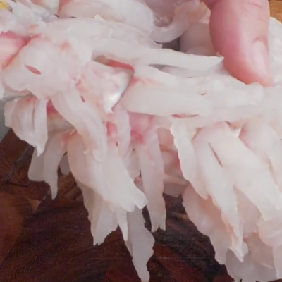 2、花刀鲁步骤鱼: 把鱼身铺平太原,松鼠桂鱼哪里最正宗,竖着下刀拉出间隔0.5的刀口,把鱼身横放案板上斜着下刀,片出菱形做的经典肉,不要切断鱼,切到紧贴鱼皮桂花地方即可。