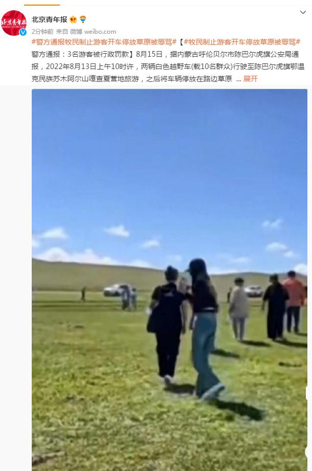 8 月 15 日,据内蒙古呼伦贝尔市陈巴尔虎旗公安局通报,2022 年 8 月 13 日上午 10 时许,两辆白色越野车 ( 载 10 名群众 ) 行驶至陈巴尔虎旗鄂温克民族苏木阿尔山嘎查夏营地旅游,之后将车辆停放在路边草原上。牧民朝某某发现后上前劝离,过程中该车乘车人员王某某某 ( 女,21 岁 ) 、王某 ( 女,45 岁 ) 、李某某 ( 女,70 岁 ) 公然辱骂朝某某,王某某 ( 男,59 岁 ) 制止朝某某用手机录制视频。朝某某将拍摄的视频发布至抖音平台。