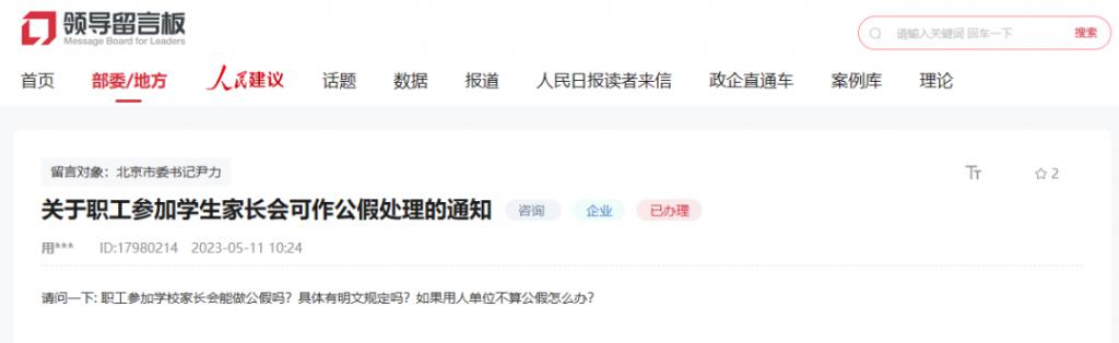 北京通州这位网民 5 月 11 日在人民网 " 领导留言板 " 留言称,职工参加学生家长会算什么假?能作公假吗?具体有明文规定吗?如果用人单位不算公假怎么办?