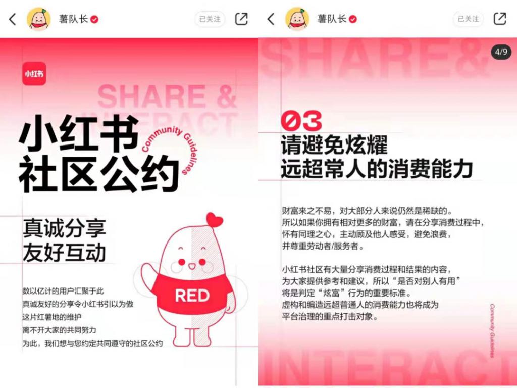 同年 4 月,小红书也上线《社区公约》,明确抵制炫富,要求社区创作者在分享内容时避免炫耀远超常人的消费能力。