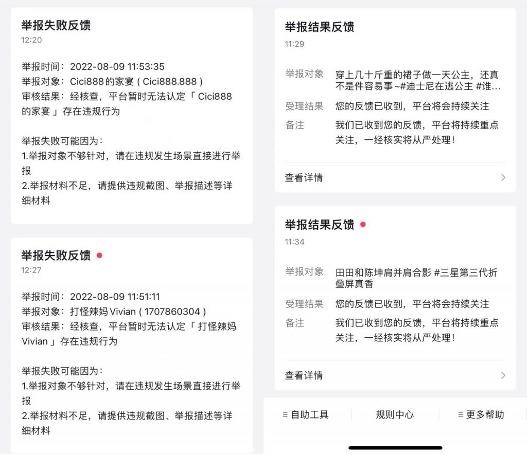 有网友反映,在平台上看到炫富内容时,举报常常因举证不足而以失败告终。平台给出受理结果 " 您的反馈已收到,平台将会持续关注 ",便再无下文。