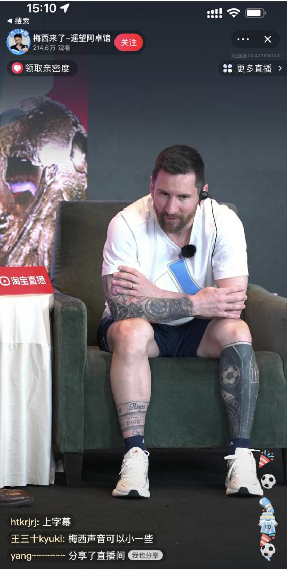 6 月 14 日下午 3 点,阿根廷足球明星梅西亮相淘宝直播间,直播间观看人次一度超 210 万。