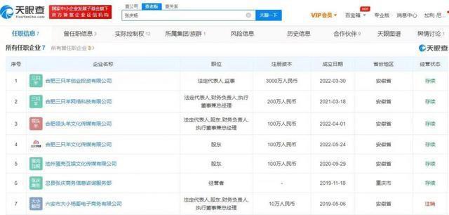 天眼查 App 显示,疯狂小杨哥张庆杨目前关联企业共 7 家,存续状态的有 6 家。其中,张庆杨在合肥三只羊创业投资有限公司、合肥三只羊网络科技有限公司、合肥领头羊文化传媒有限公司中担任法定代表人、执行董事、财务负责人等职位,同时担任合肥领头羊文化传媒有限公司、合肥三只羊文化传媒有限公司、池州蛋壳互娱文化传媒有限公司的股东,此外,他还是忠县张庆商务信息咨询服务部的经营者。