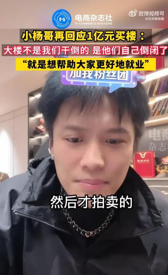 根据阿里拍卖,小杨哥买下的这处资产是科技公司合肥嘉东光学股份有限公司的基地。该消息一出立刻引发网友的关注,有网友调侃称一个网红把一个科技公司干倒了。11 月 8 日晚,小杨哥直播再度回应买楼称 " 那个科技公司早在 17 年就倒闭了,只是我们现在买了下来。买楼是为了把公司做得更大,帮助大家更好地就业。"