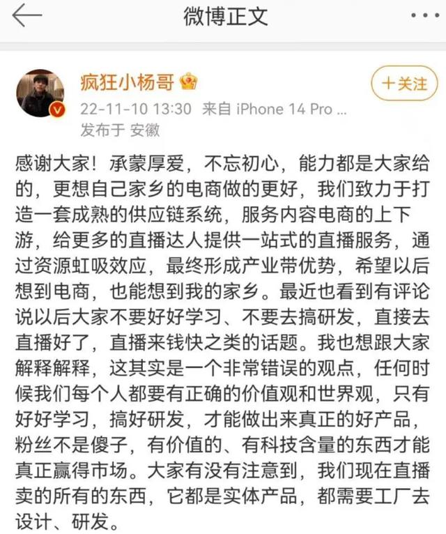 10 日中午," 疯狂小杨哥 " 也更新了微博,文中称,能力都是大家给的,更想自己家乡的电商做的更好,正致力于打造一套成熟的供应链系统,服务内容电商的上下游,给更多的直播达人提供一站式的直播服务,通过资源虹吸效应,最终形成产业带优势," 希望以后想到电商,也能想到我的家乡 "。