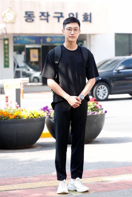 除了宽松的版型之外,正肩黑T恤对于显身材来说也至关重要。纯棉的质地即使拥有强壮的肌肉,也能保持较好的舒适度,配一条西裤呈现商务风,搭一条短裤则满满运动风。