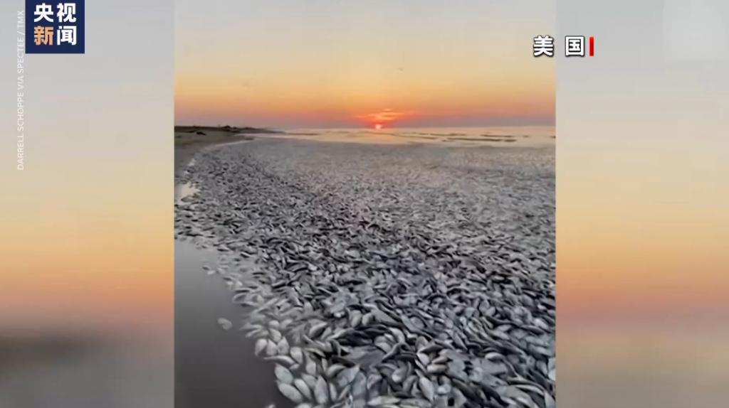而同样的场景在 6 月 9 日也出现在美国得克萨斯州墨西哥湾沿岸的海滩上,大量死鱼密密麻麻连绵数公里。