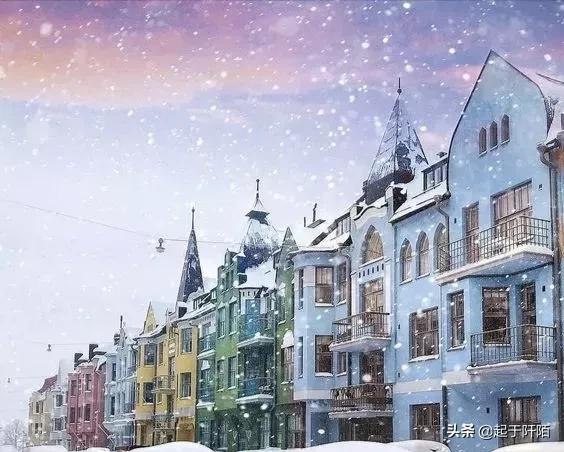 看赫尔辛基这些五颜六色的楼房,每个造型都不同,有尖顶的,有圆弧的,披着一层雪霜好似童话世界一般。