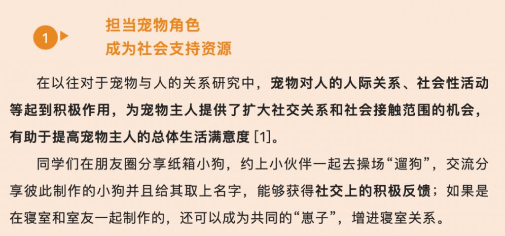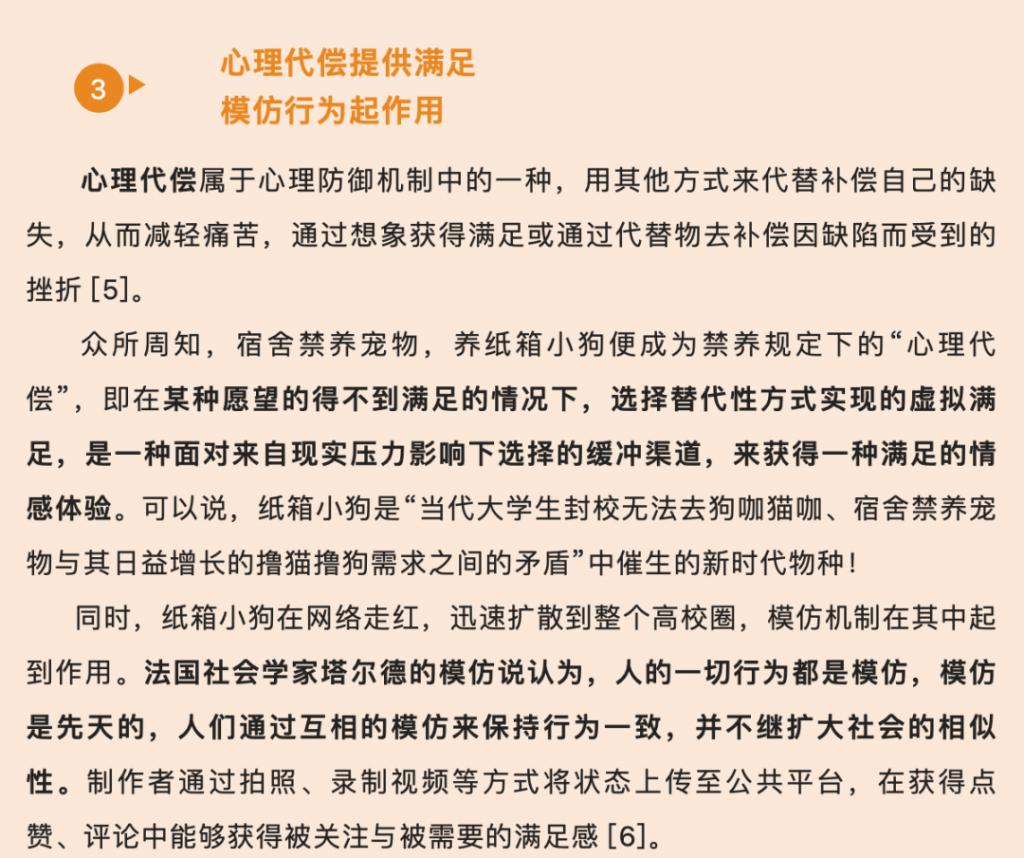 哈尔滨医科大学心理与行为研究中心主任杨艳杰表示,养 " 纸盒狗 " 是年轻人自我排解的一种方式,高校 " 养狗热 " 体现了大学生的社交渴望和陪伴需求。此外专家提到,大学生的精神状态也值得关注。
